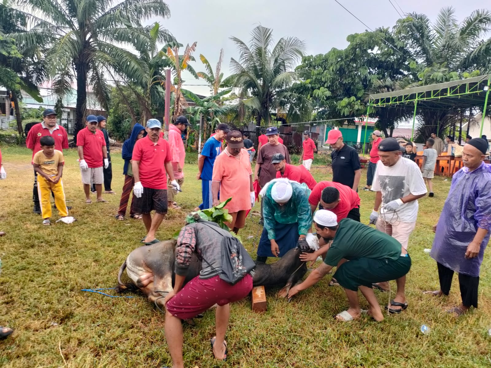 Pemotongan hewan kurban itu diselenggarakan, Sabtu pagi 7 Mei 2025 di komplek Masjid Iqrak, disaksikan para peserta kurban, jemash masjid dan masyarakat sekitar masjid.