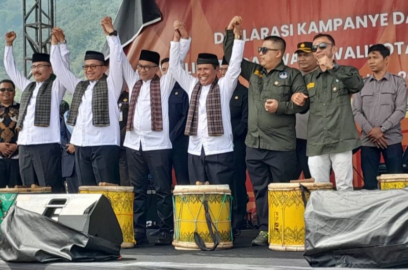 Deklarasi kampanye damai tersebut ditandai dengan pemukulan gendang di atas panggung yang sudah disiapkan oleh KPU Padang Panjang.