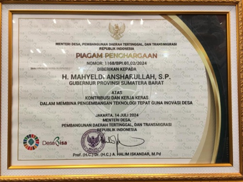 “Alhamdulillah, tentu saja piagam serta lencana ini merupakan buah kerja keras kita di Pemprov Sumbar, dalam mengembangkan ekosistem serta penerapan teknologi tepat guna inovasi desa di Sumbar. Kami ucapkan terima kasih kepada Bapak Menteri Desa PDTT atas penghargaan ini,” ujar Gubernur yang di saat bersamaan tengah berada di Sumbar untuk mengikuti sejumlah giat kedinasan.