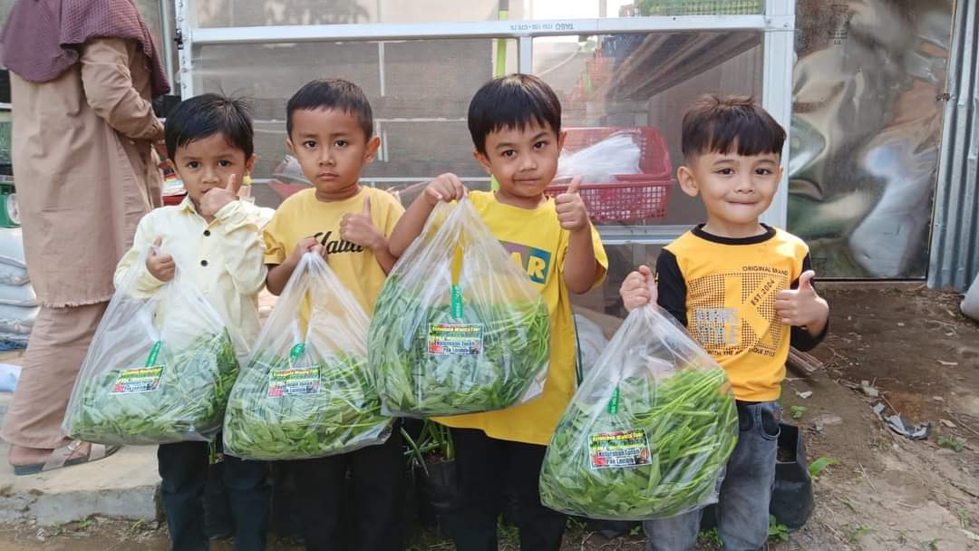 Ketua KWT, Sri dan timnya sangat men-support kegiatan ini. Ia memberikan informasi tentang sayuran kepada anak-anak dan timnya membimbing saat memanen sayur kangkung.