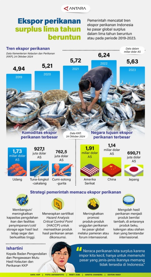 MINANGKABAUNEWS.com, INFOGRAFIS — Pemerintah mencatat tren ekspor perikanan Indonesia ke pasar global surplus dalam lima tahun beruntun atau pada periode 2019-2023. (ANTARA)