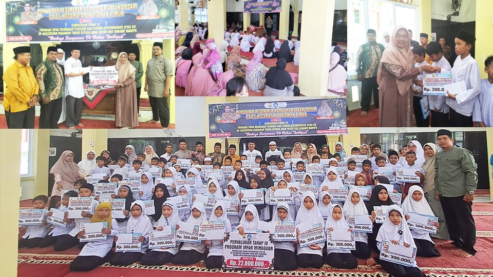 MINANGKABAUNEWS, PARIAMAN — Pendidik dan Tenaga Kependidikan (PTK) SD se-Kecamatan Pariaman Timur Kota Pariaman salurkan Tahap IV Program Infak Mingguan Kepada anak yatim dan kurang mampu, sekaligus Penutupan Pesantren Ramadhan 1445 H/2024 M SD se-Kecamatan Pariaman Timur, di Mesjid Baiturahhim Desa Talago Sariak, Kecamatan Pariaman Timur, Rabu (3/4/2024).