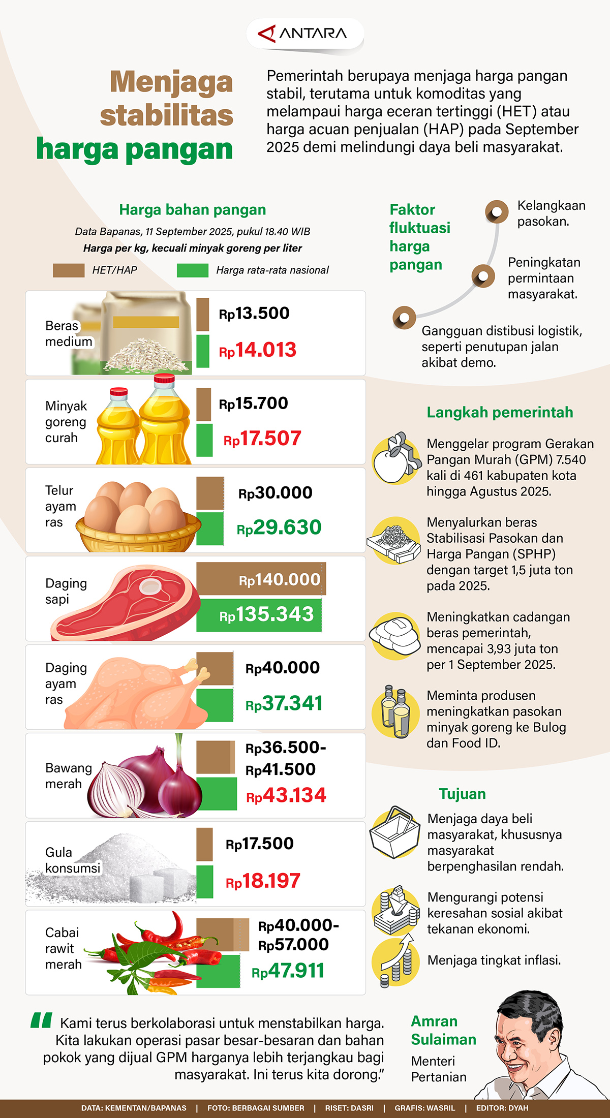 MINANGKABAUNEWS.com, INFOGRAFIS — Pemerintah berupaya menjaga harga pangan stabil, terutama untuk komoditas yang melampaui harga eceran tertinggi (HET) atau harga acuan penjualan (HAP) pada September 2025 demi melindungi daya beli masyarakat. (ANTARA)