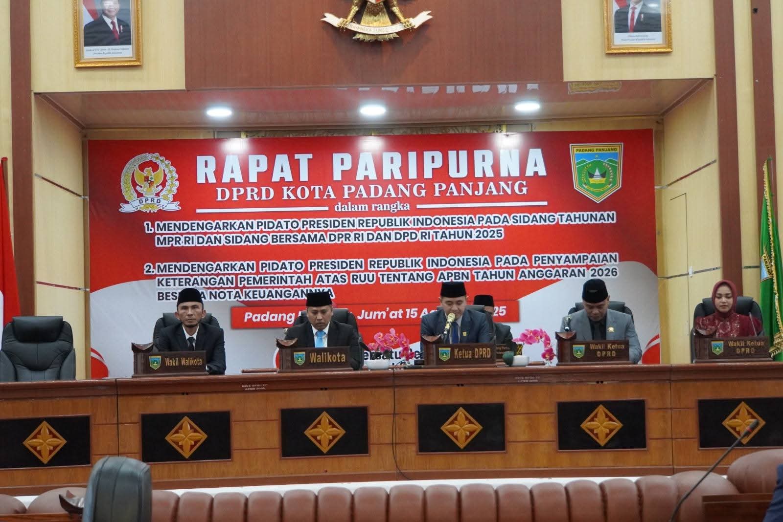 MINANGKABAUNEWS.COM,PADANG PANJANG – Wali Kota, Hendri Arnis bersama Wakil Wali Kota, Allex Saputra, dan Forum Koordinasi Pimpinan Daerah (Forkopimda) mengikuti secara virtual Pidato Kenegaraan Presiden RI, Prabowo Subianto pada Sidang Tahunan MPR RI, DPR RI, dan DPD RI 2025. Kegiatan berlangsung di Ruang Sidang DPRD Kota Padang Panjang, Jumat (15/8/2025).