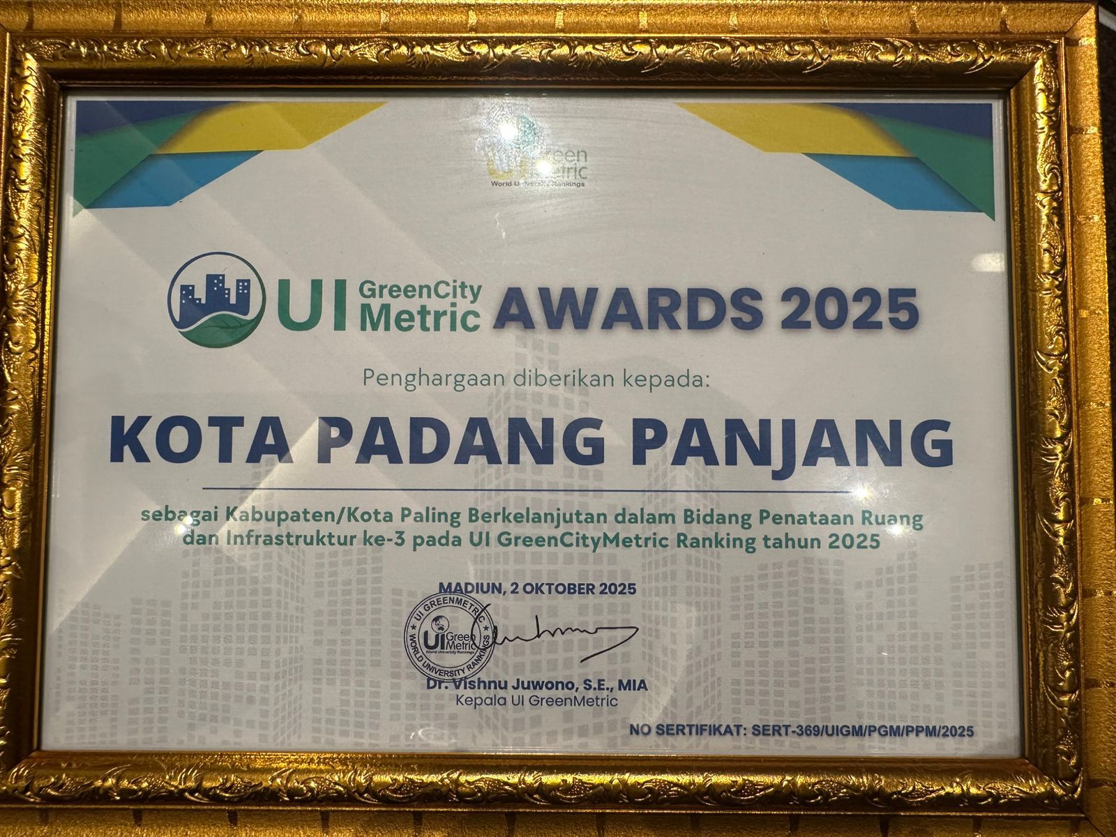 Penghargaan diserahkan di Hotel Mercure, Kota Madiun, Kamis (2/10). Hendri Arnis menerima langsung penghargaan bergengsi ini, yang menjadi bukti nyata keberhasilan kepemimpinannya dalam membangun kota hijau dan ramah lingkungan.