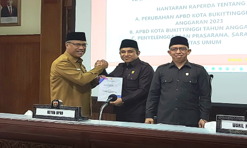 MINANGKABAUNEWS.com, BUKITTINGGI – Wakil Wali Kota (Wawako) Bukittinggi menghantarkan Rancangan Peraturan Daerah (Ranperda) perubahan Anggaran Pendapatan Belanja Daerah (APBD) 2023 dan APBD tahun anggaran 2024 dan Ranperda penyelenggaraan prasarana, sarana dan utilitas umum.