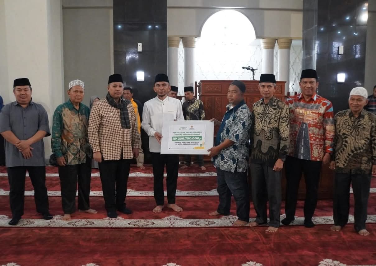 MINANGKABAUNEWS.COM,PADANG PANJANG – Wali Kota, Hendri Arnis dan Wakil Wali Kota, Allex Saputra serahkan secara simbolis Bantuan Program Padang Panjang Cerdas dari Badan Amil Zakat Nasional (Baznas) kepada 233 mustahik, di Masjid Agung Manarul ‘Ilmi Islamic Centre, Sabtu (26/7/2025).